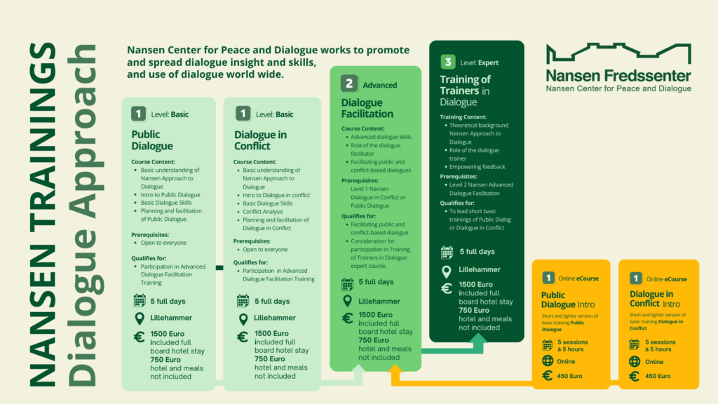 «Dialog i konflikter» er et introduksjonskurs som tar for seg ulike tema som kan bidra til å endre konflikter, inkludert verktøy for kommunikasjon og konfliktanalyse. Dette er et fem-dagers prosessorientert kurs med en rekke øvelser hvor deltakerne aktivt tar utgangspunkt i egne livserfaringer.