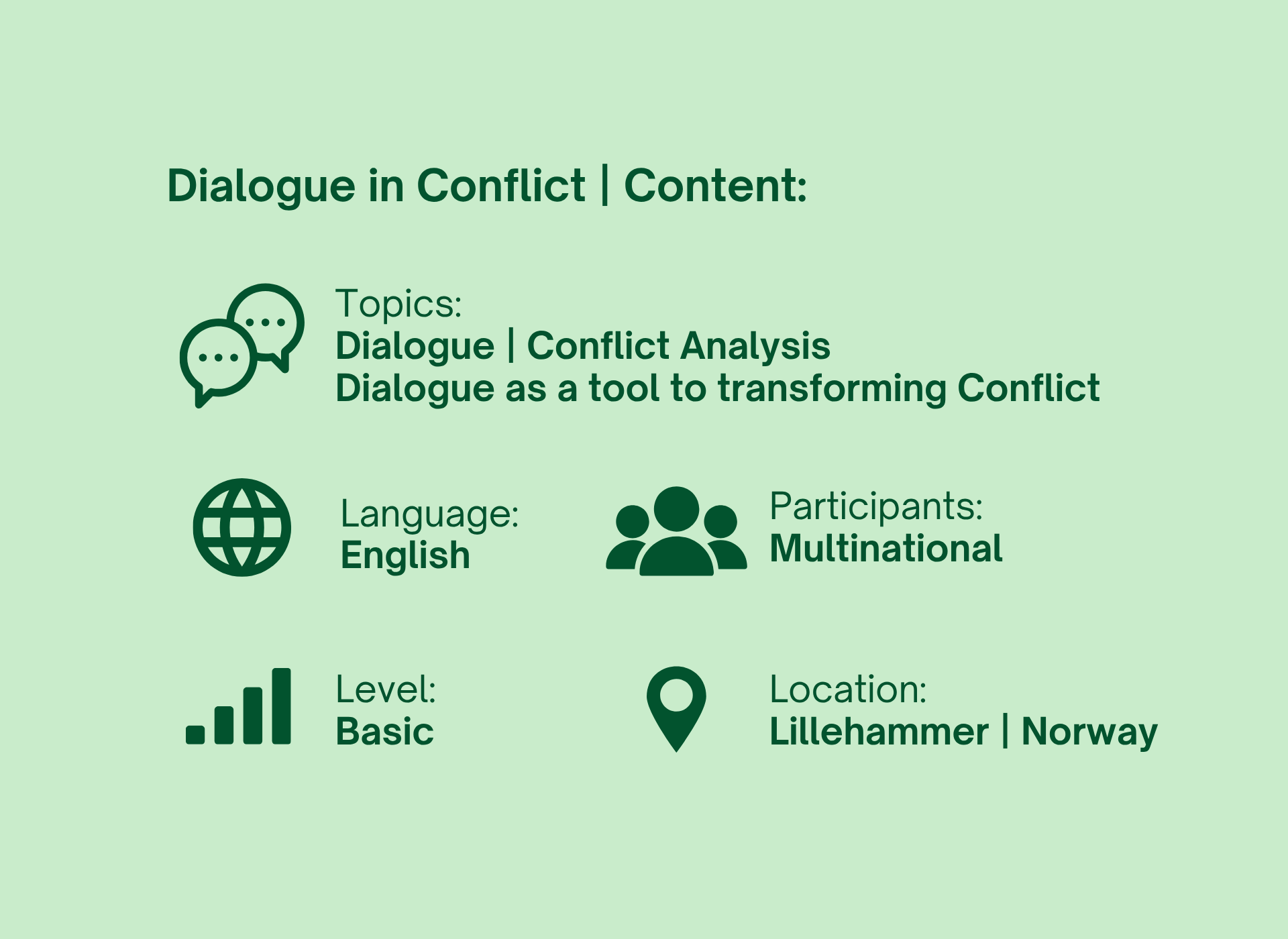 «Dialogue in Conflict» is an introductory course, addressing various topics that can contribute to transforming conflicts, including tools for communication and conflict analysis. This is a five-day process-oriented course with a series of exercises where the participants actively use their own life experiences.