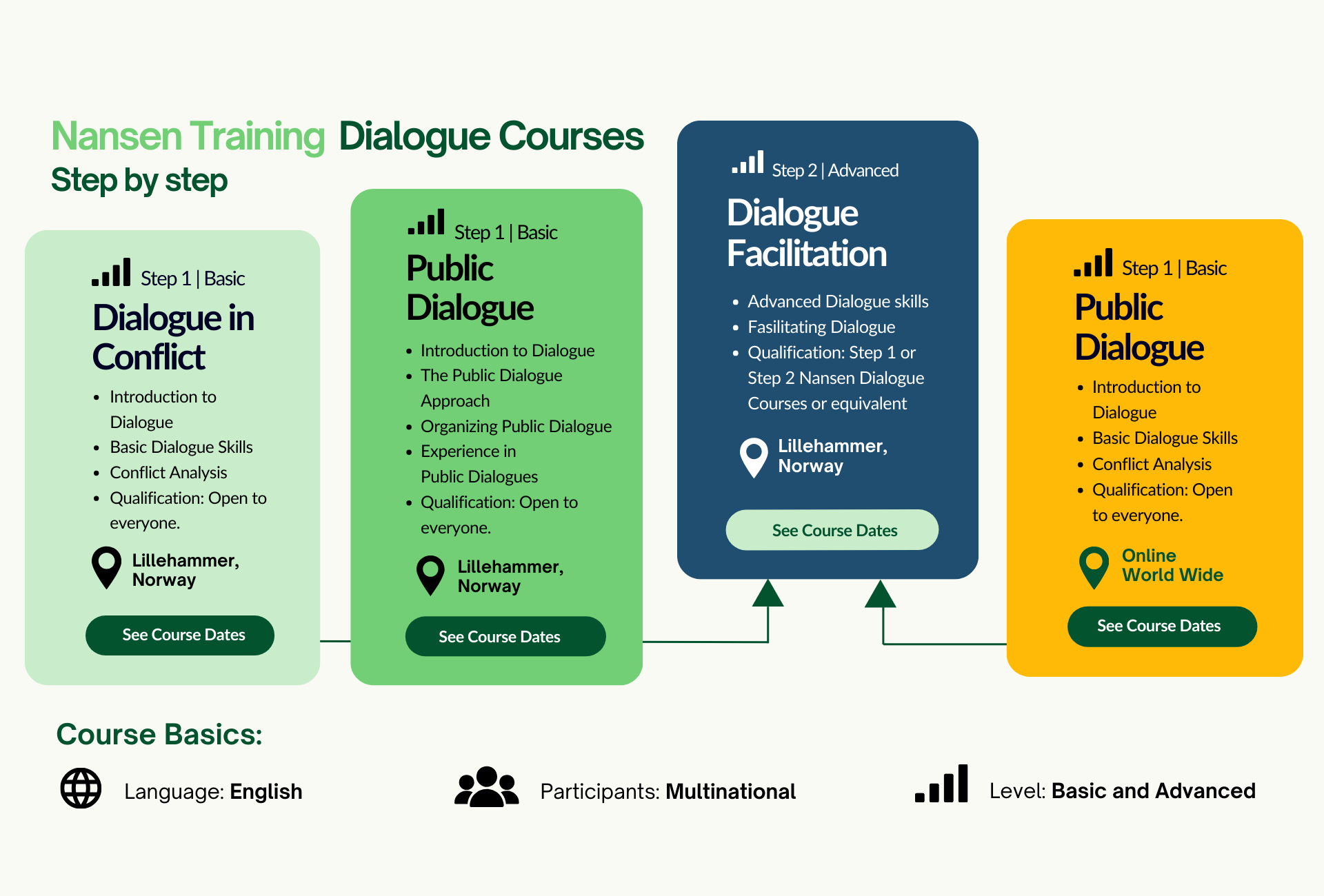 The Nansen Center for Peace and Dialogue develops courses based on our own and others' experiences with peace and dialogue work. The main course content focuses on dialogical principles and methods, conflict analysis and practical skills in dialogue facilitation.