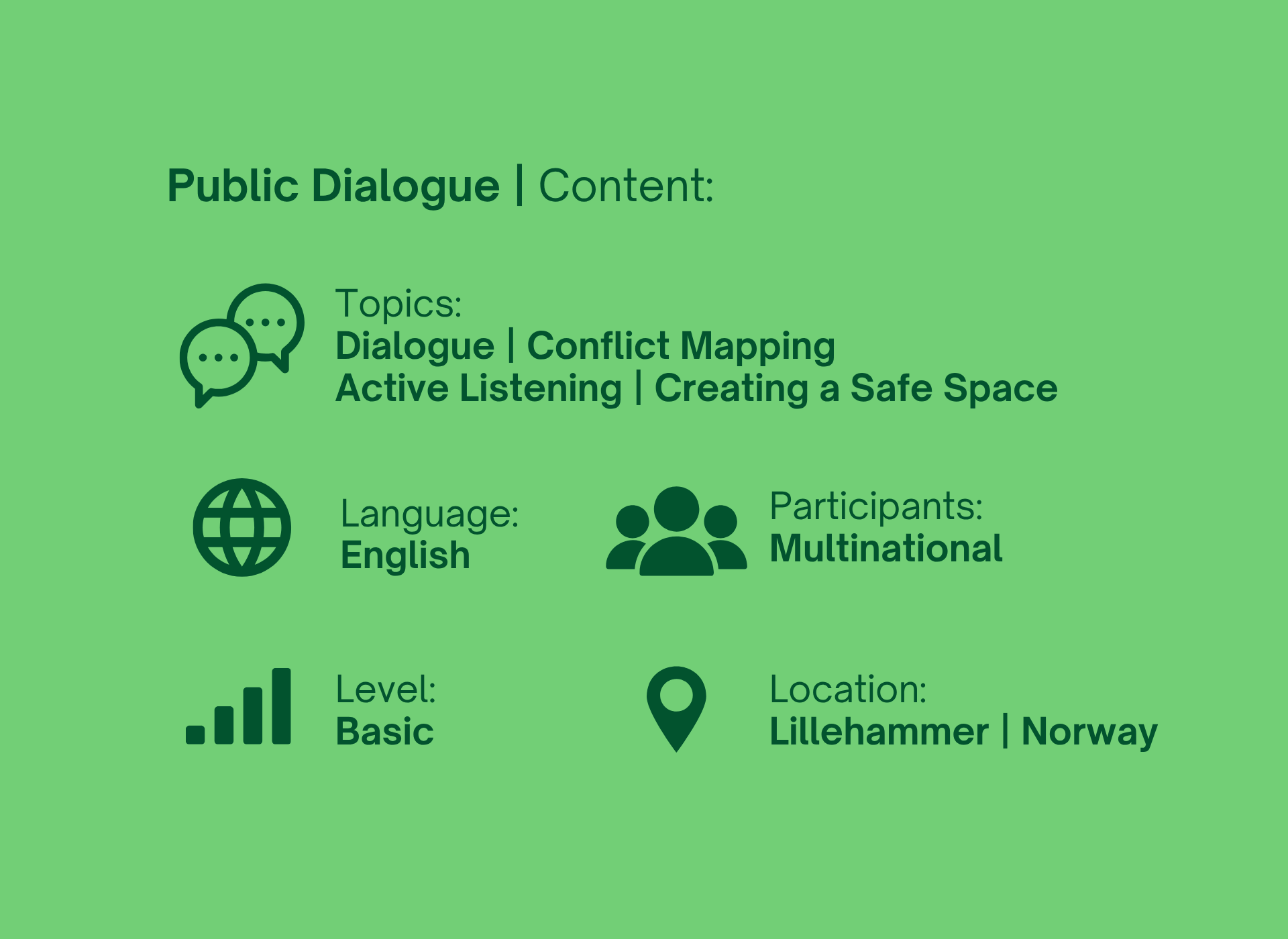 Anyone who wants to organize inclusive and dialogical public conversations – in a neighborhood, at the workplace, or to highlight important conversations in local communities. This course is structured so that each participant can use the given tools and exercises afterwards, both privately and professionally.